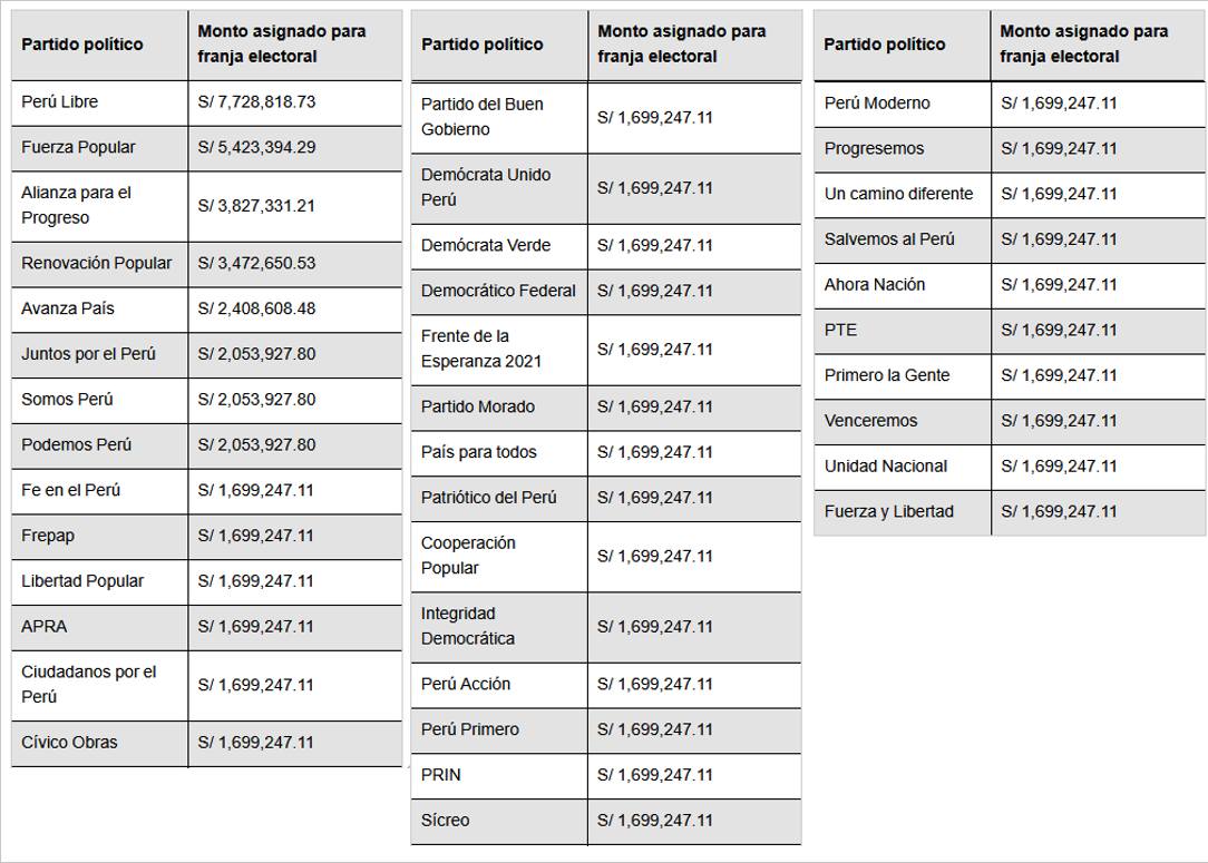 De acuerdo con la Ley de Organizaciones Políticas (LOP), se distribuyó S/8. 709.182,60 entre los partidos de manera igualitaria para la contratación de medios digitales (redes sociales). En división, cada uno obtuvo S/229.189,02.